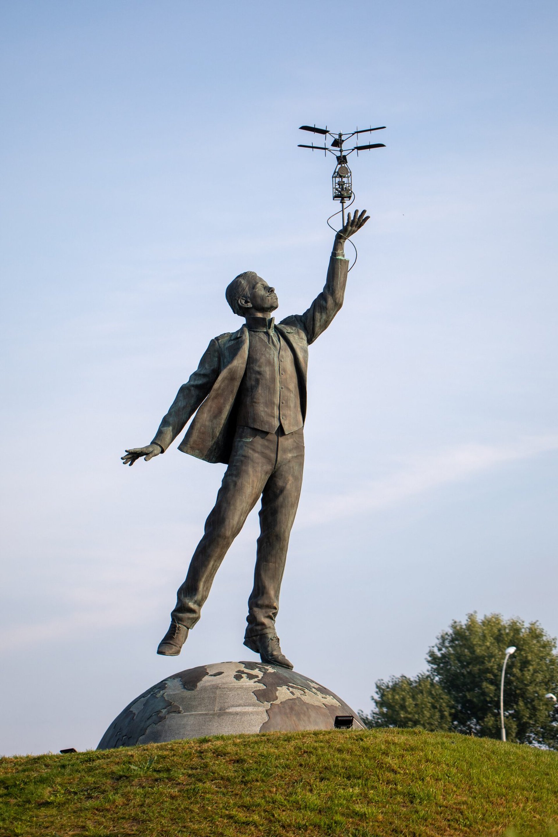 Since Sikorsky was the designer of the world’s first helicopter, he is depicted holding a prototype of his creation. The sculpture is kinetic: during strong gusts of wind, the helicopter blades rotate.