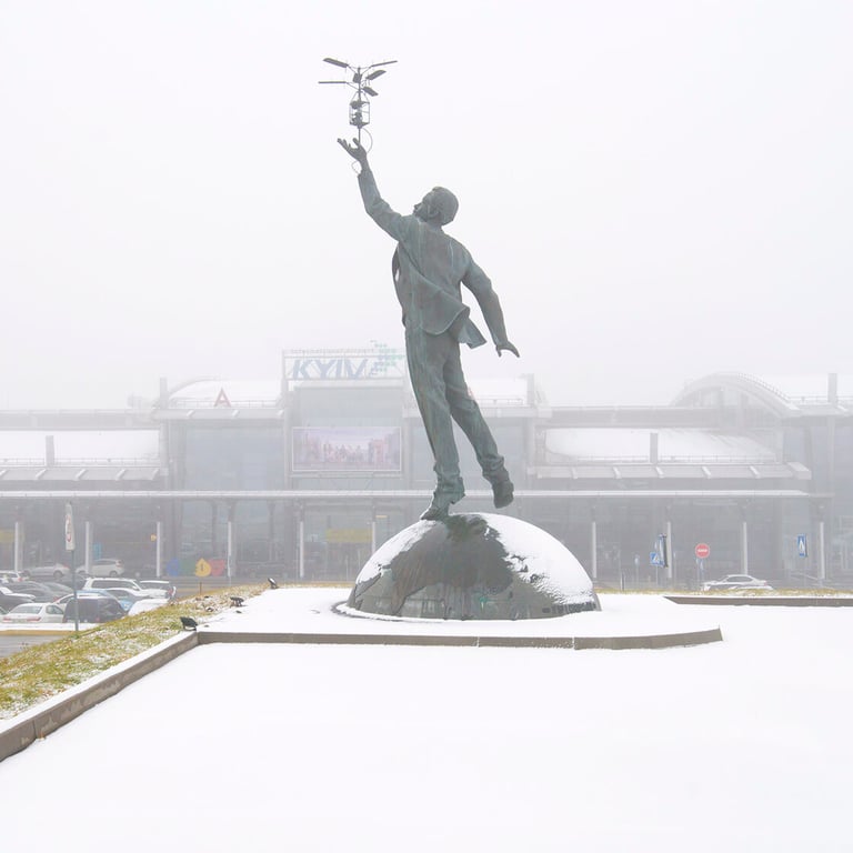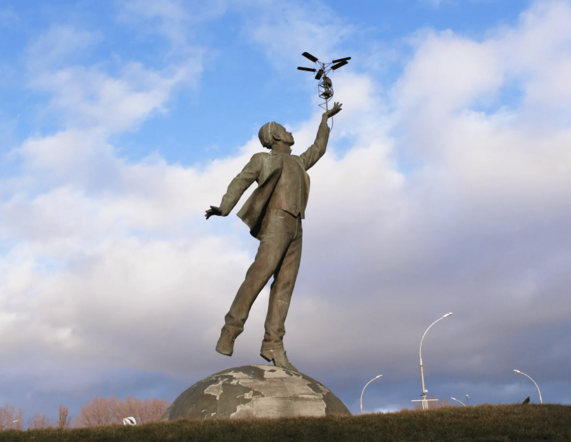 Zhurovel developed several sketches, from which the best design was selected. Extensive research on Igor Sikorsky’s life and achievements was conducted, forming the foundation for the final image of the aviation pioneer. The sculpture of Sikorsky stands on a pedestal shaped like a hemisphere with a stylized world map. The figure is supported at a single point, giving the impression of taking off from the ground