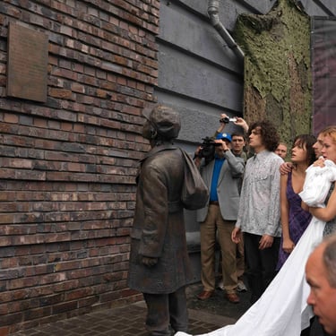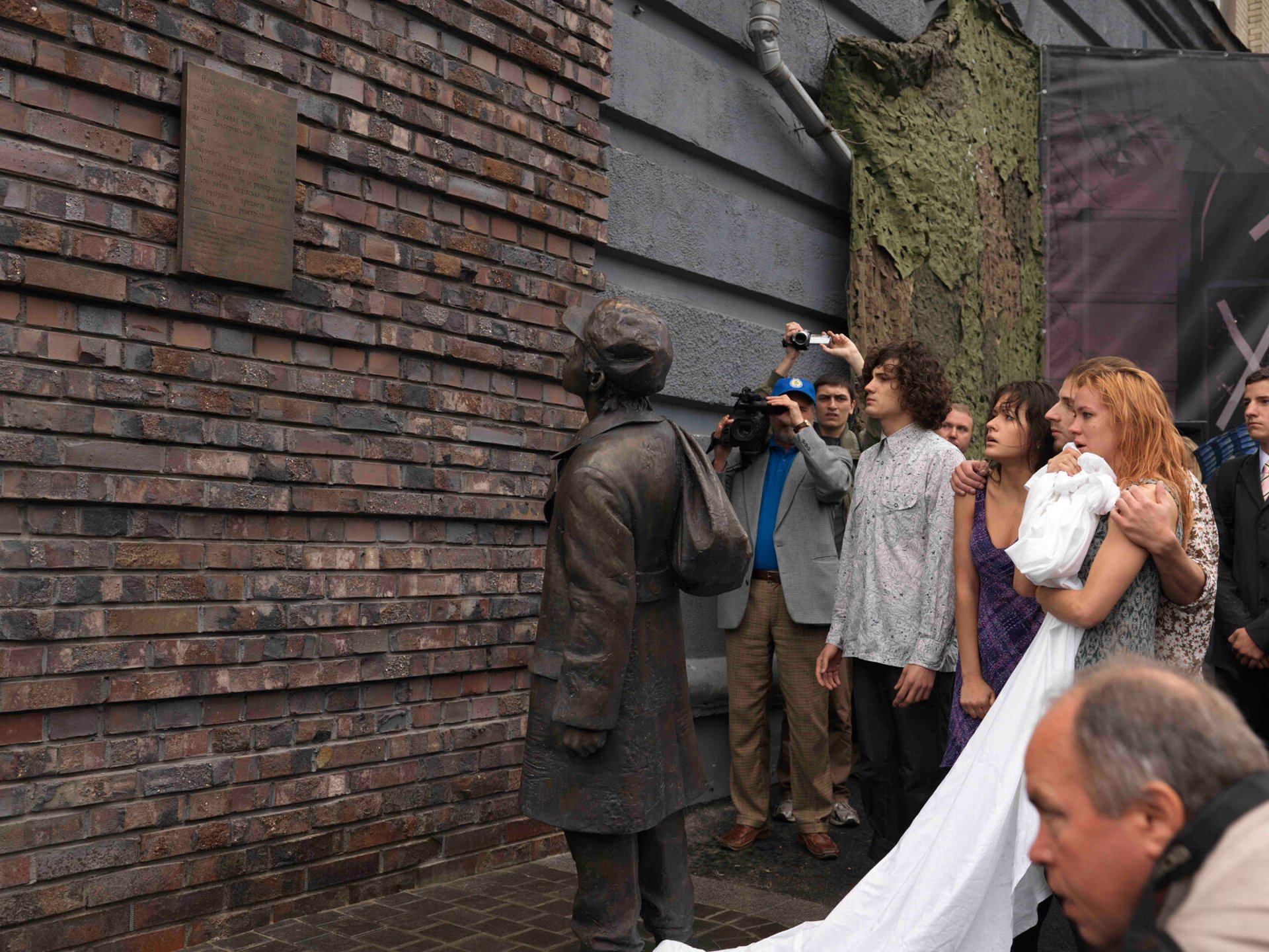Відкриття пам'ятника було зроблено у вигляді театральної вистави, яка відтворювала атмосферу того часу. Вулиця перекрита колючим дротом, встановлені протитанкові їжаки. Група імітаторів військових періоду ВВВ виступила в ролі німецьких фашистів, також до неї були підключені кінологи з вівчарками.